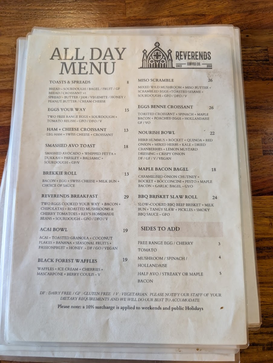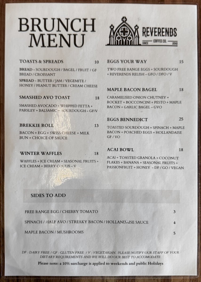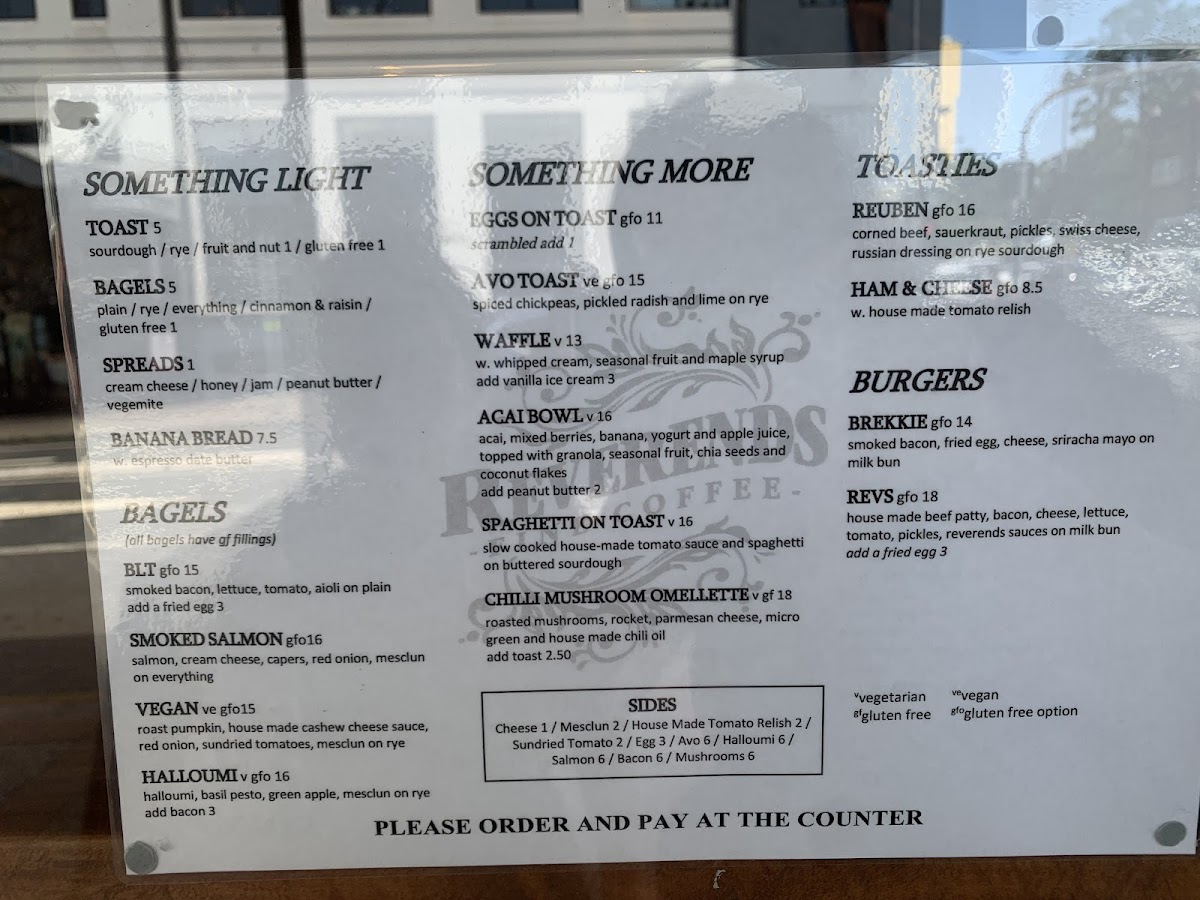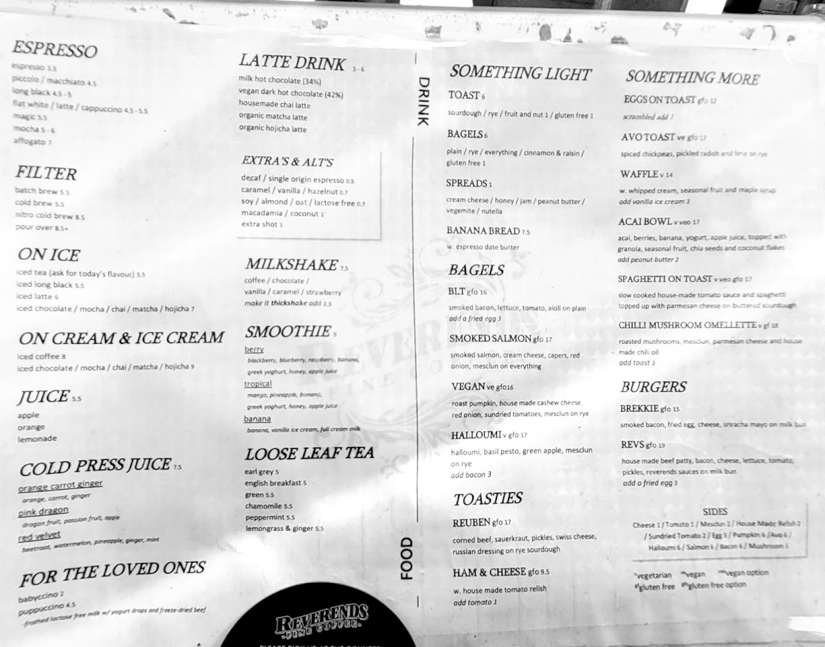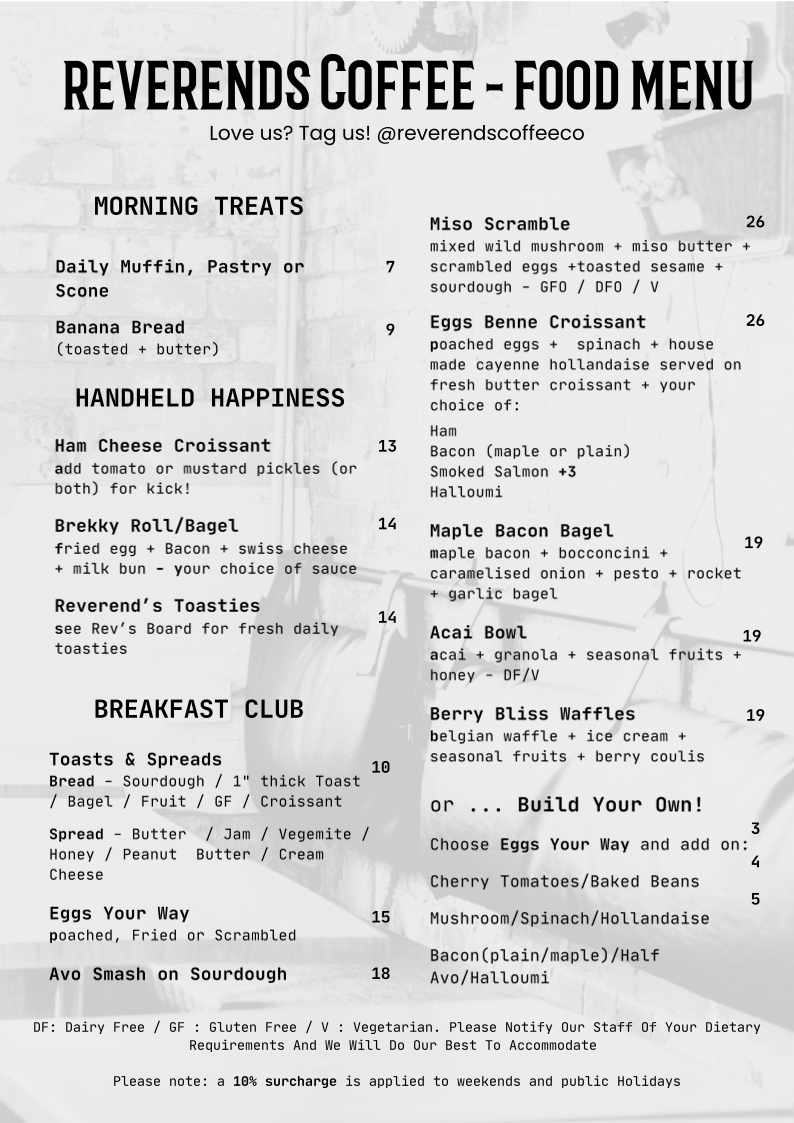 Nestled in the heart of Fortitude Valley, at 372 Brunswick St, Reverends Coffee Co invites you to embark on a delightful culinary journey with our enticing menu. Whether you're a devoted coffee lover or a food enthusiast, our signature offerings are crafted to tantalize your taste buds. Start your day with a rich Flat White or a creamy Cappuccino, and don't miss our standout Chilli Mushroom Omelette that packs a flavorful punch. For those seeking a hearty meal, our Reverends Burger and The Reuben Sandwich are sure to impress, while our selection of Bagels, Breakfast Burgers, and Bircher Muesli cater to every craving. We also offer delectable treats like Vegan Danish and plain Croissants that perfect your mid-morning coffee experience. With highlights including filter coffee, maccha lattes, and even Babycinos for the little ones, there’s something to make everyone feel welcome. Come savor the essence of community and comfort food at Reverends Coffee Co, where every bite and sip tells a story!