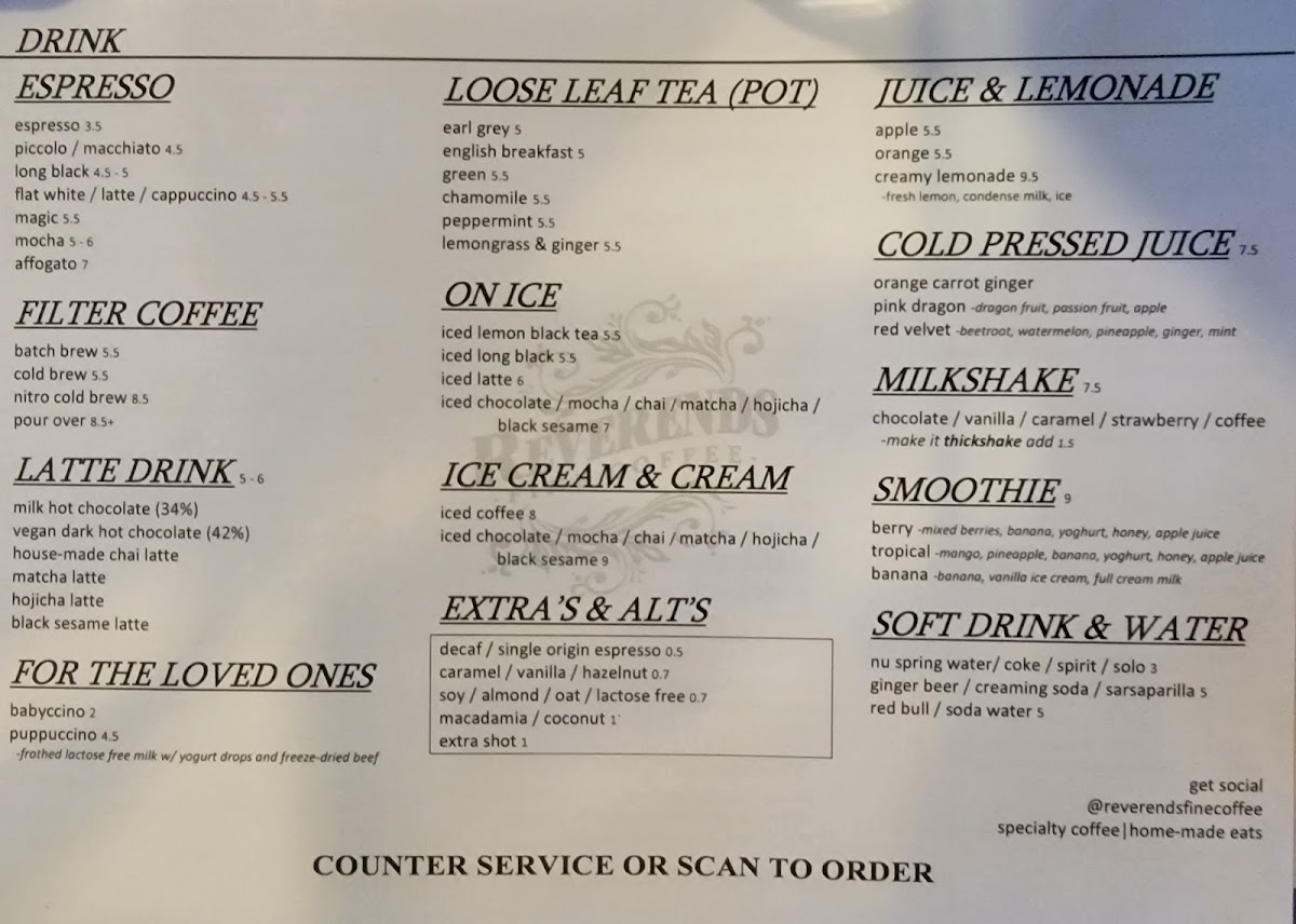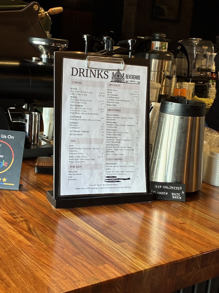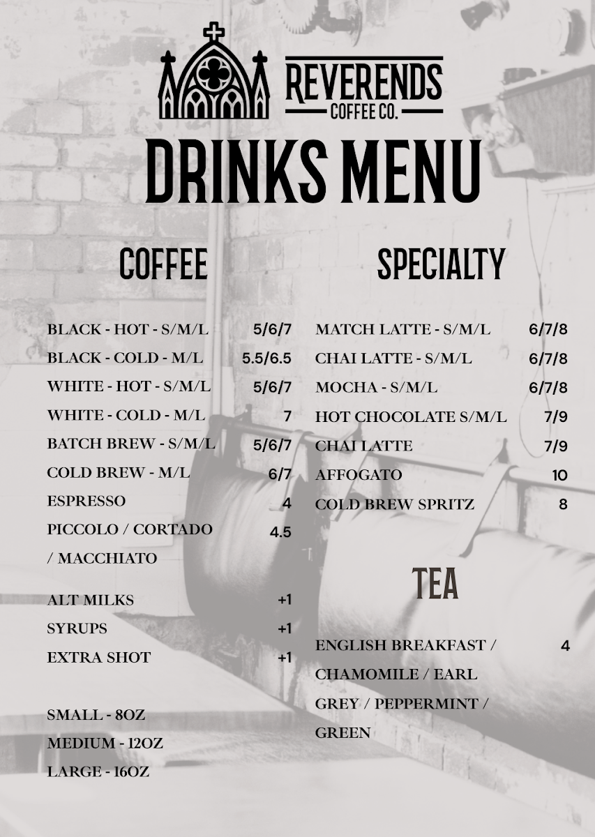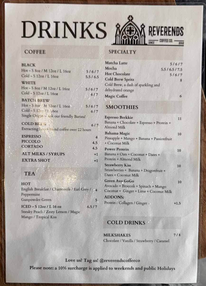Nestled in the heart of Fortitude Valley, at 372 Brunswick St, Reverends Coffee Co invites you to embark on a delightful culinary journey with our enticing menu. Whether you're a devoted coffee lover or a food enthusiast, our signature offerings are crafted to tantalize your taste buds. Start your day with a rich Flat White or a creamy Cappuccino, and don't miss our standout Chilli Mushroom Omelette that packs a flavorful punch. For those seeking a hearty meal, our Reverends Burger and The Reuben Sandwich are sure to impress, while our selection of Bagels, Breakfast Burgers, and Bircher Muesli cater to every craving. We also offer delectable treats like Vegan Danish and plain Croissants that perfect your mid-morning coffee experience. With highlights including filter coffee, maccha lattes, and even Babycinos for the little ones, there’s something to make everyone feel welcome. Come savor the essence of community and comfort food at Reverends Coffee Co, where every bite and sip tells a story!